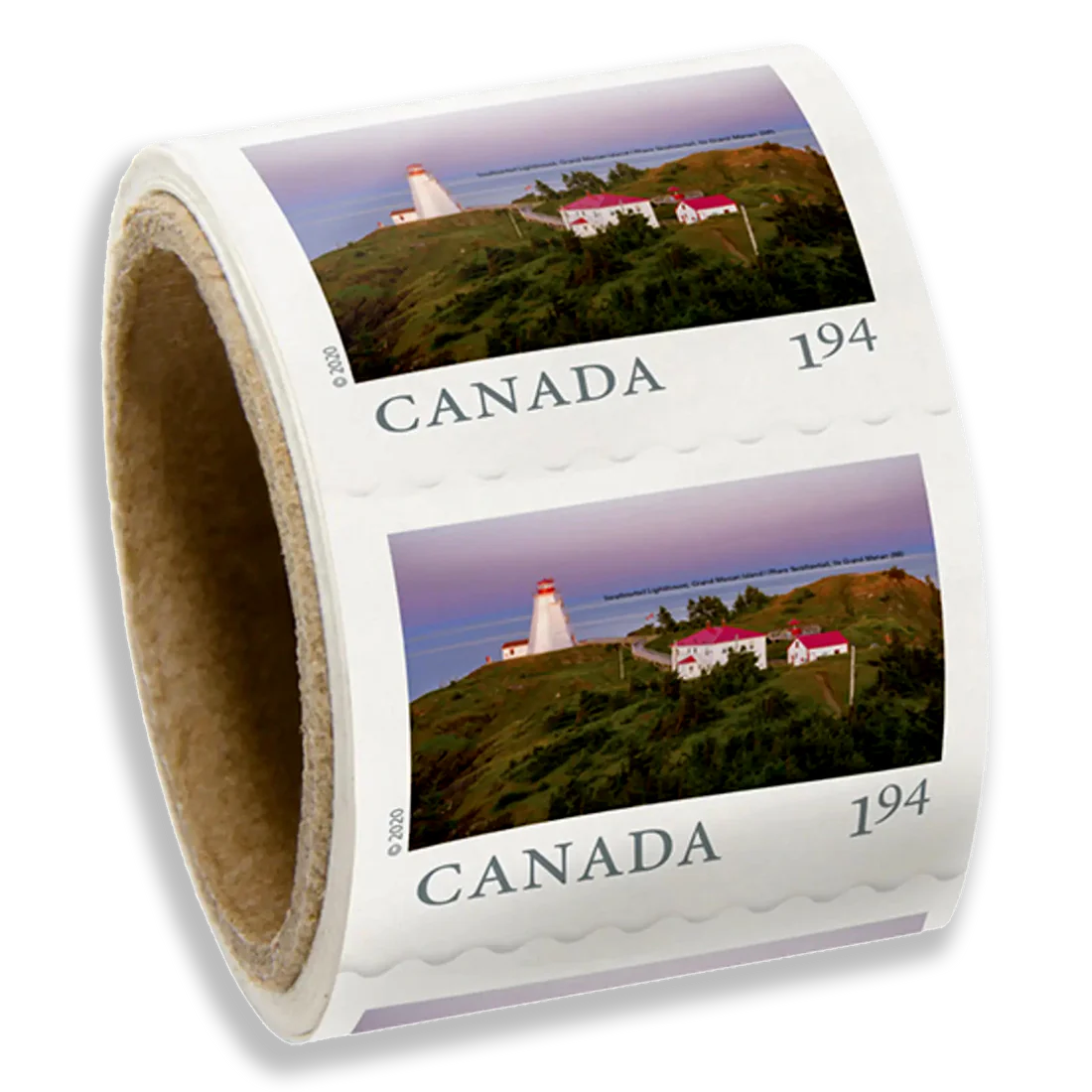 Experience the unique beauty of New Brunswick with this coil of 50 oversized rate stamps featuring Grand Manan Island's historic Swallowtail Lighthouse. Oversized rate stamps are required for larger documents and unusually shaped envelopes weighing up to 100 grams.